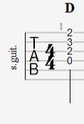 Thema heute ist das Erzeugen von Tabs mit Schlagmustern und Akkorddiagrammen. Als Beispiel habe ich eine einfache Akkordfolge gewählt: D, E, G und D.